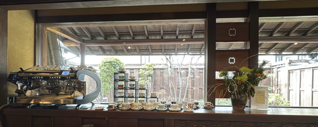 目の前には庭園、エスプレッソマシン、大事そうに並べられている器たち。新年を感じる花。