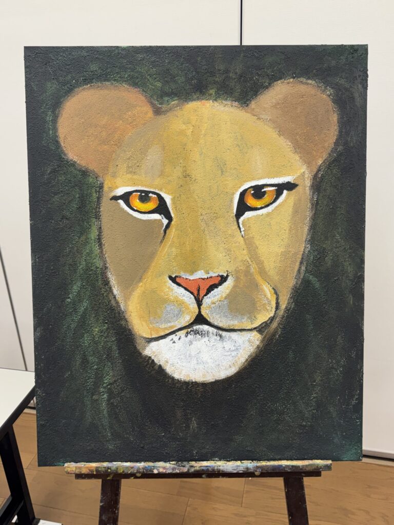 描いていたライオンを完成させようと思っていましたが、下地の塗り直しと瞳を細かく描いていたらあっという間に時間がきて終わりました。